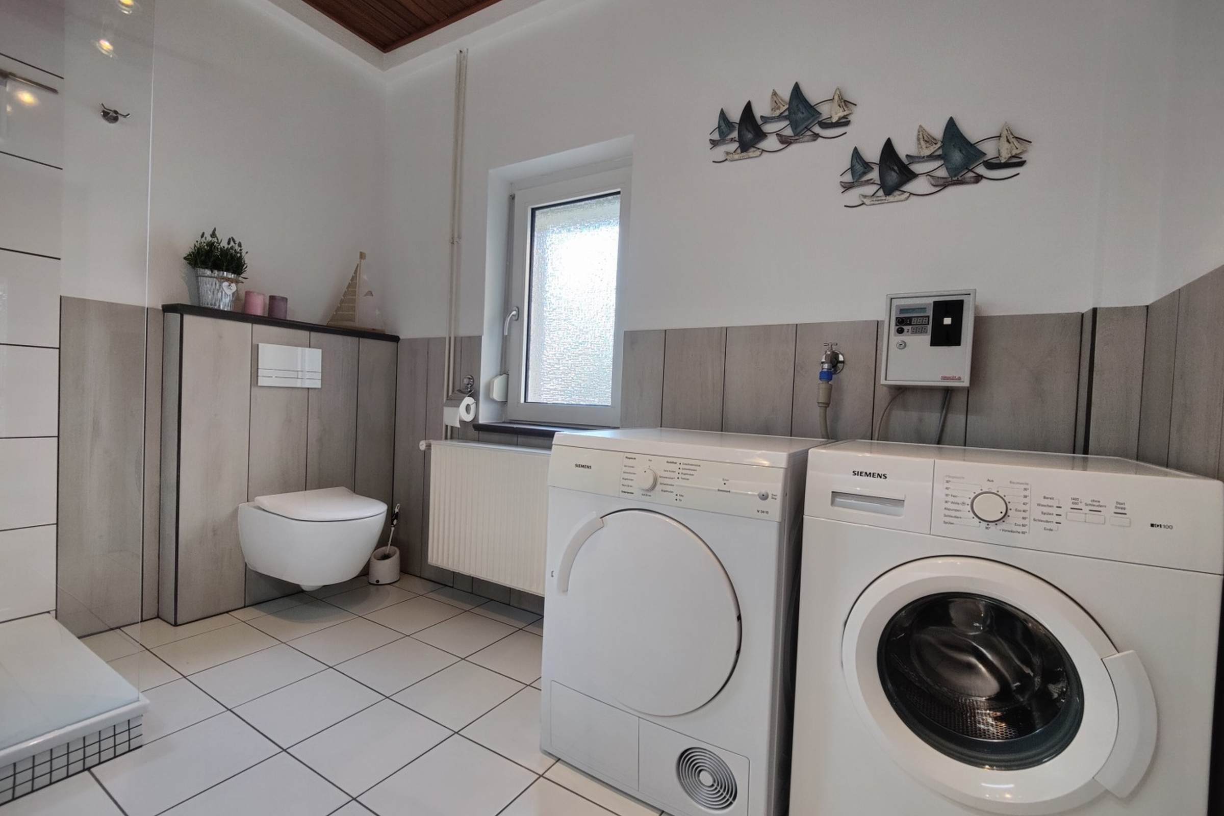 1 großzügiges Duschbad mit Walk-In-Dusche, Badhocker, Haarföhn, Waschmaschine + Trockner (mit Münzautomaten).