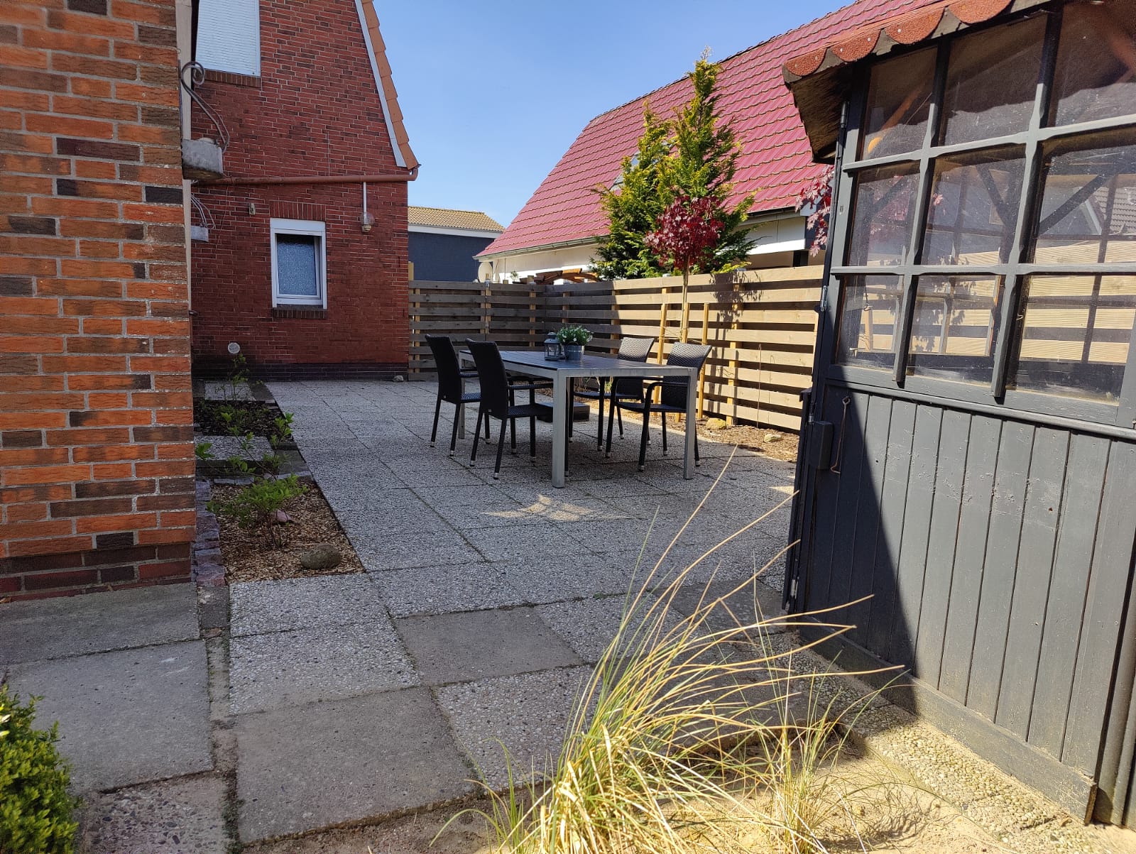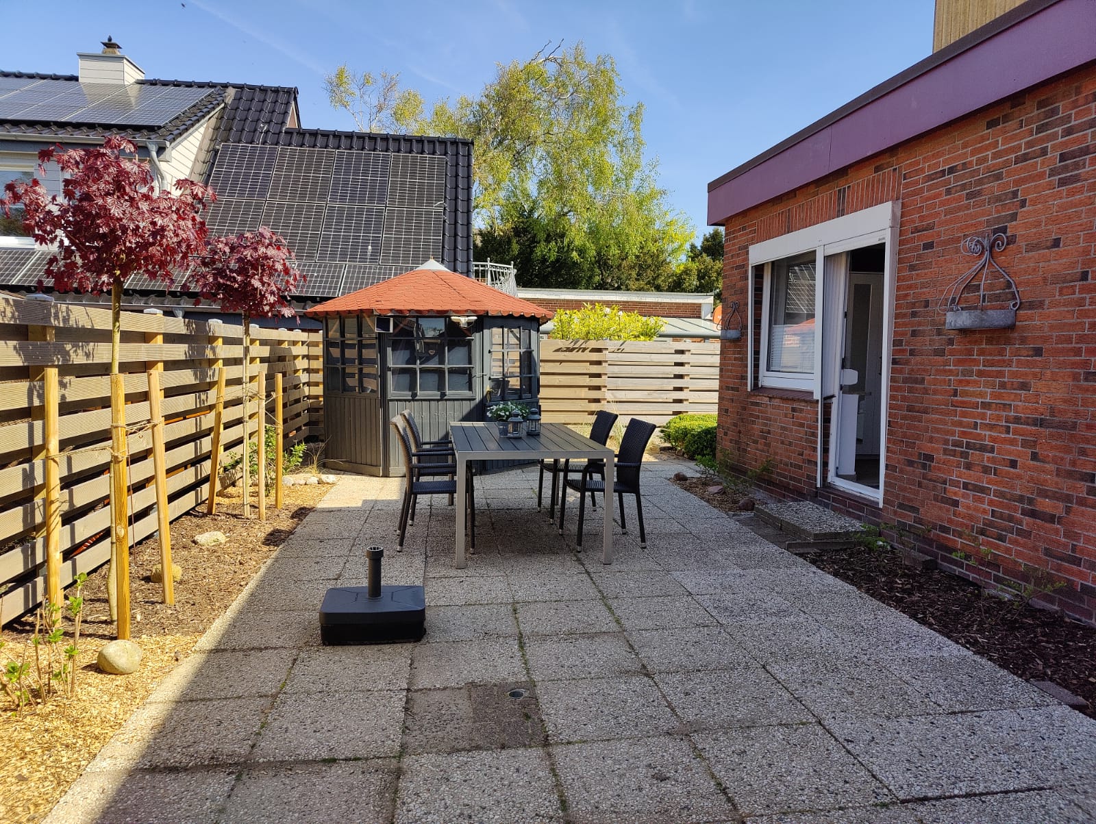 Garten mit Terrasse mit Pavillon und Gartenmöbeln (ca. Mai-Oktober).